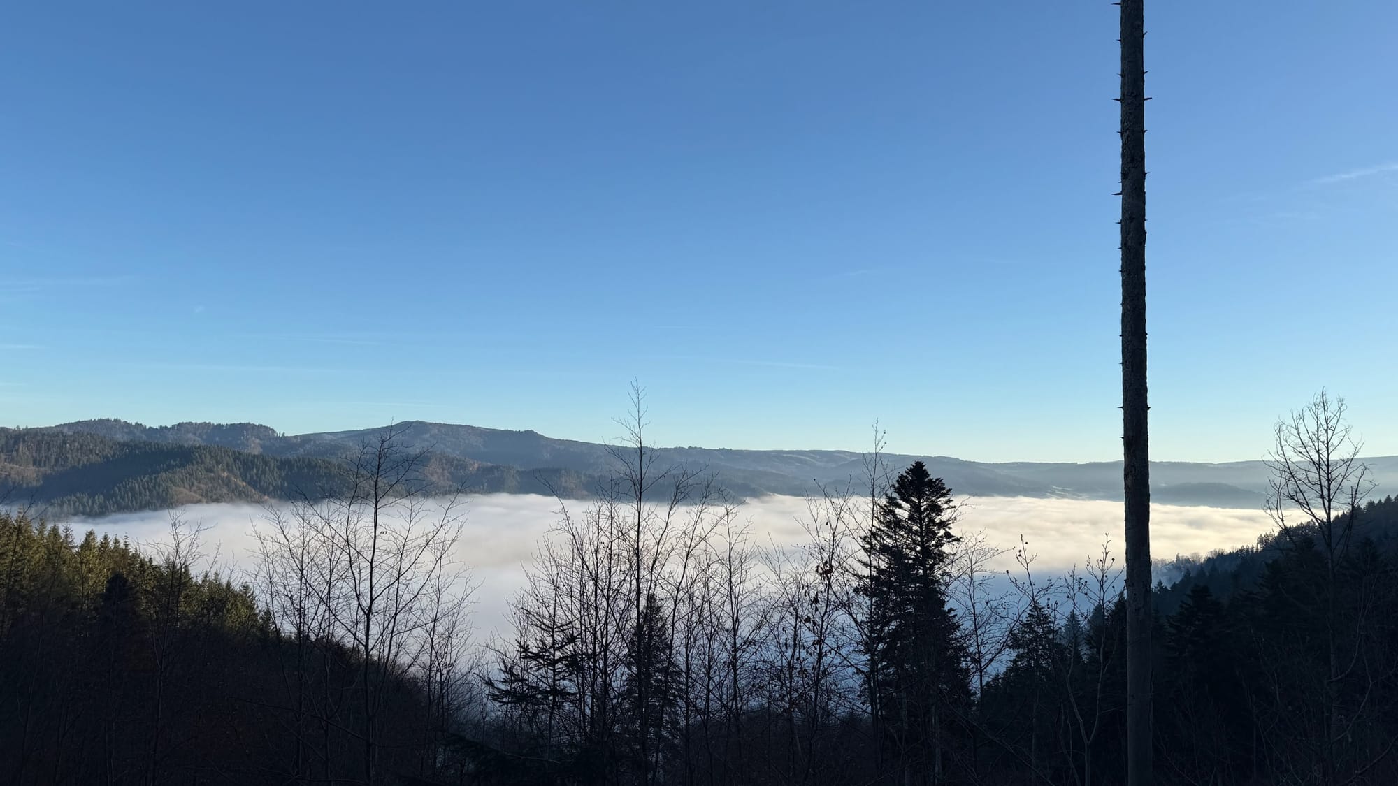 Most days, it’s just forest. Trees and trails and the quiet satisfaction of climbing. But occasionally—a few times each autumn—Freiburg gets one of those special Inversionswetterlage mornings. The phenomenon is common enough: cold air settles in the Rhine valley, warm air sits above it, and the city disappears under a blanket of fog.